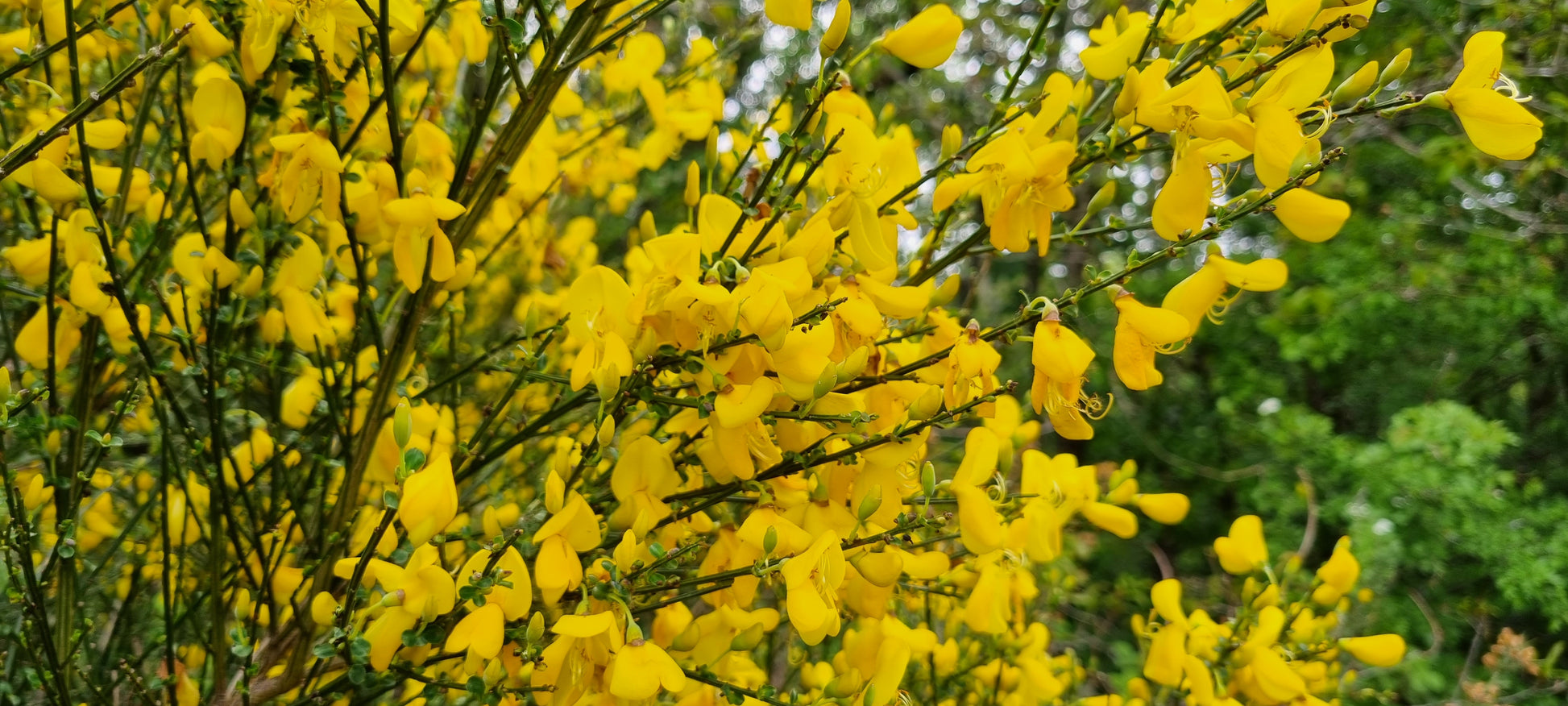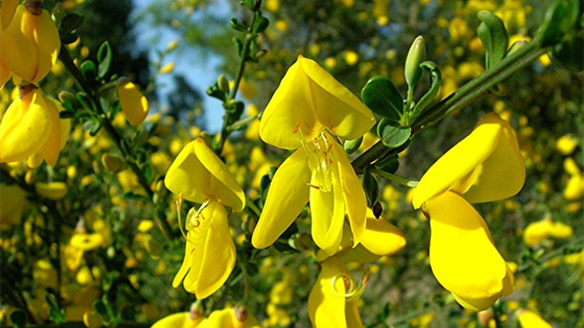 Broom is an erect deciduous, spineless shrub that produces an abundance of golden yellow pea-like flowers. Broom is often grown for the spring flowers which have vanilla-like scent. Broom enjoys sunny, well drained, sandy soils. During the summer, the hairy black seed pods can produce an audible cracking sound as they explode in the sunshine.
