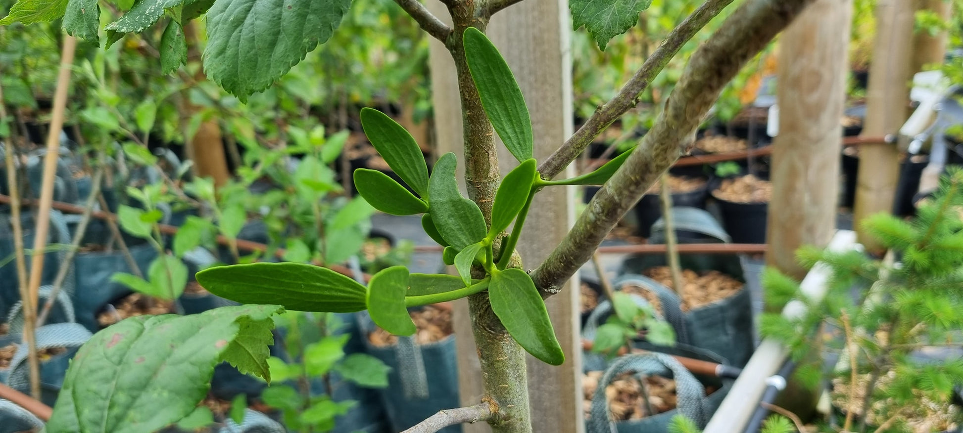 Our special native Gower Crab Apple with Mistletoe trees have taken over four years to grow from apple seeds collected on the Gower and Mistletoe seeds collected from Monmouthshire. Once seeded onto the Crab Apples, Mistletoe leaves appear in the second year, and in the third year put on a growth spurt and start branching. Female Mistletoes will start producing berries in the fifth year.