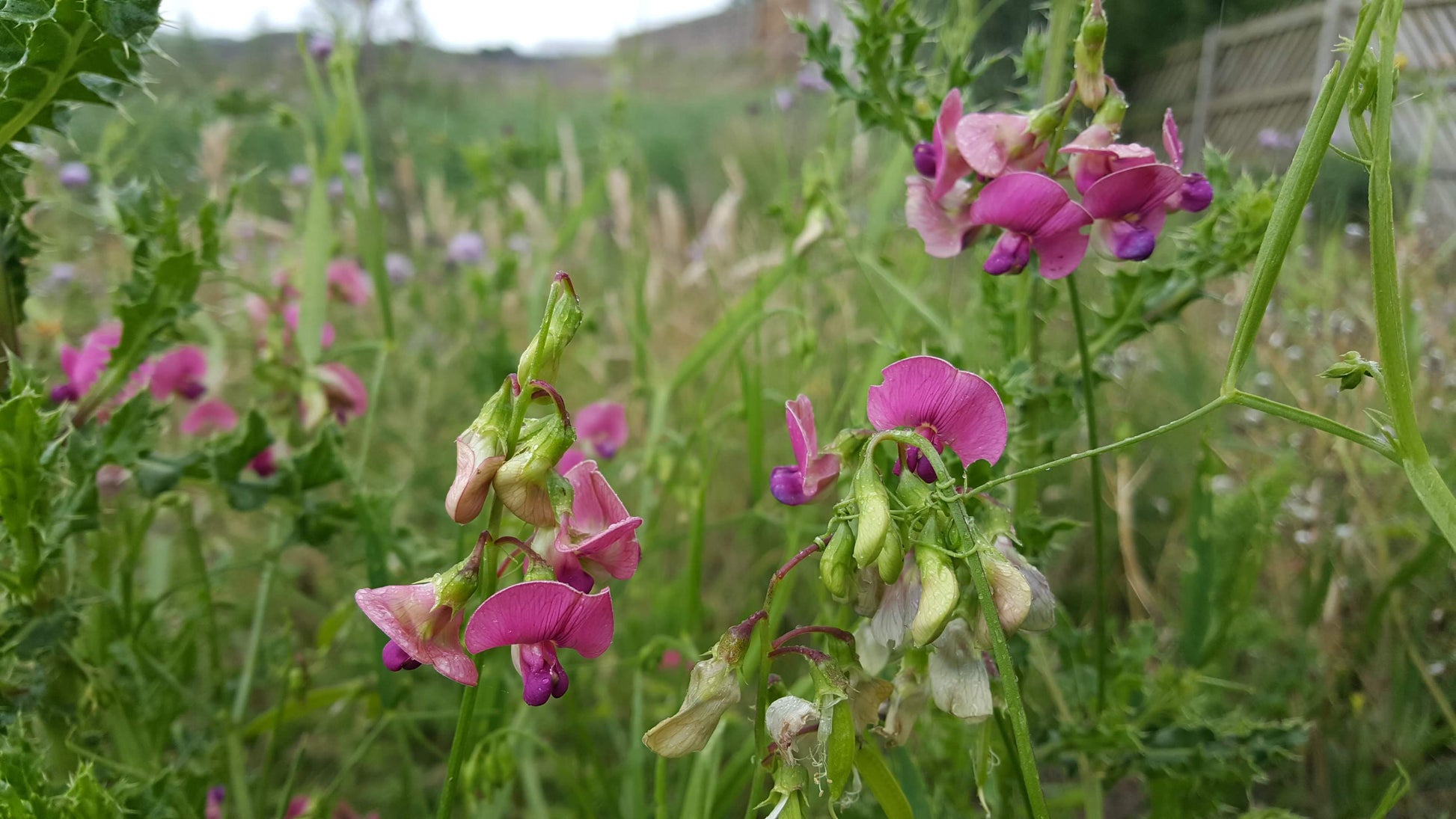 Narrow-leaved Everlasting-pea is a scrambling perennial legume. It's habitats include hedges, woodland edges, scrubby areas and rough banks. It climbs anti-clockwise using its curly tendrils and produces pairs of rose pink flowers. Unopened flowers resemble clogs.