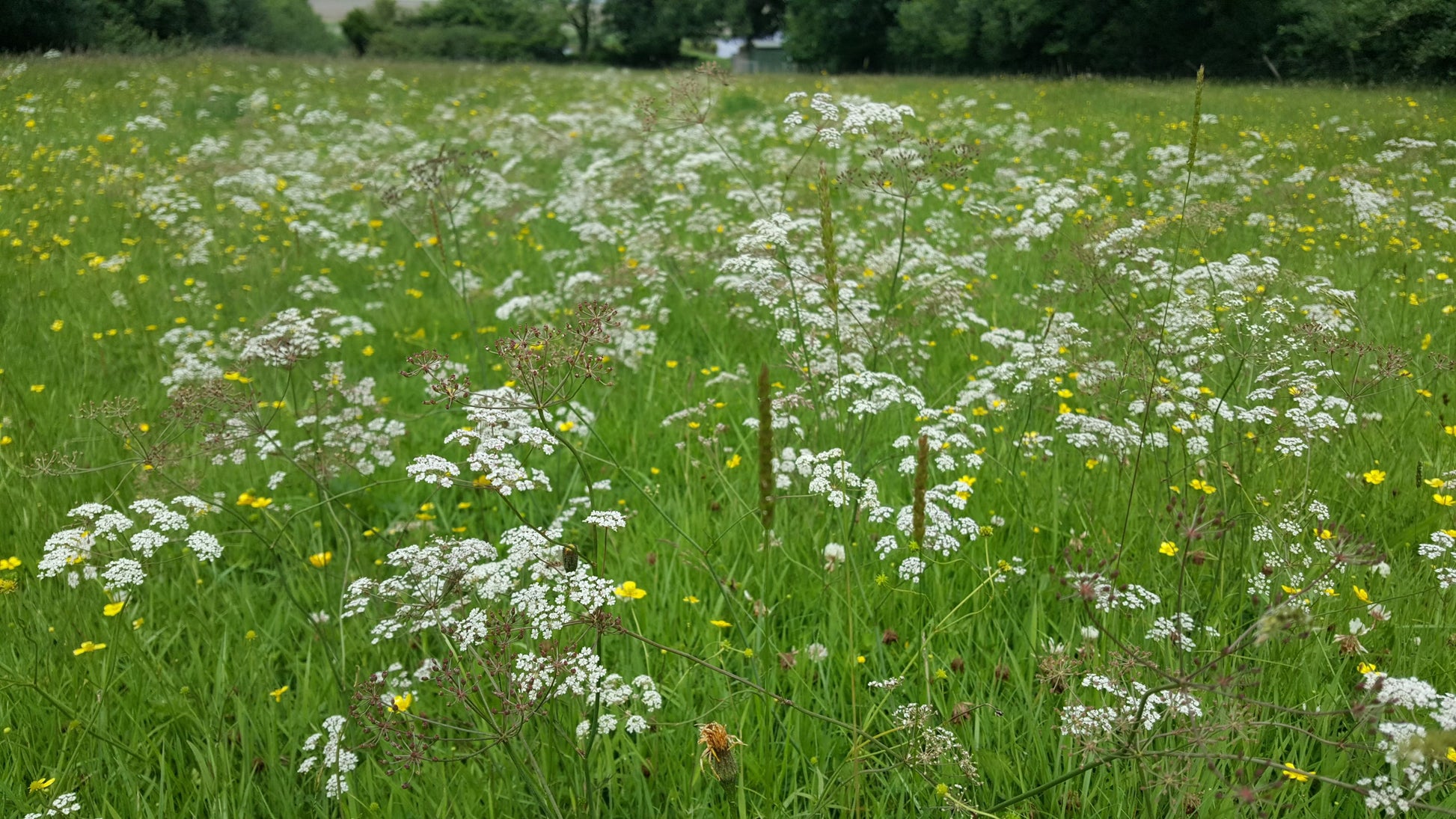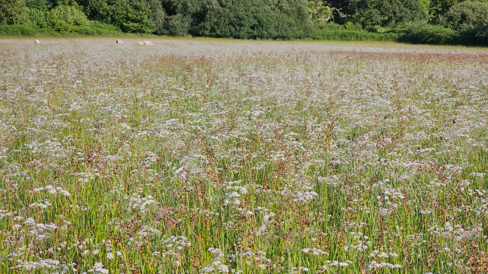 A rare plant found mostly in damp marshes, rushy pastures and stream sides in Wales. It has delicate white umbels of flowers and narrow leaves that appear to surround the central stem in rings.