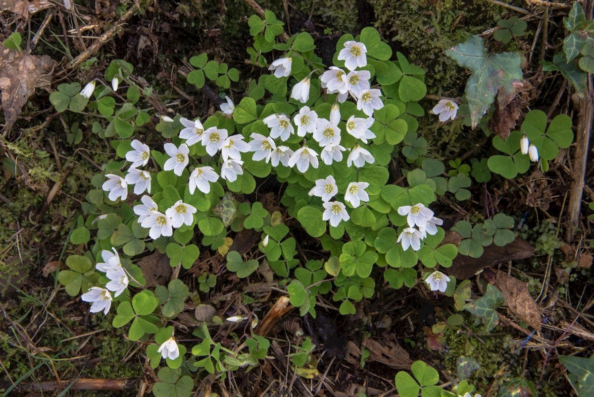 A spreading perennial plant of shaded woods and hedgerows that can grow under trees in a garden. The delicate leaves and purple-veined flowers open and close by the sun. An early nectar source for pollinators.
